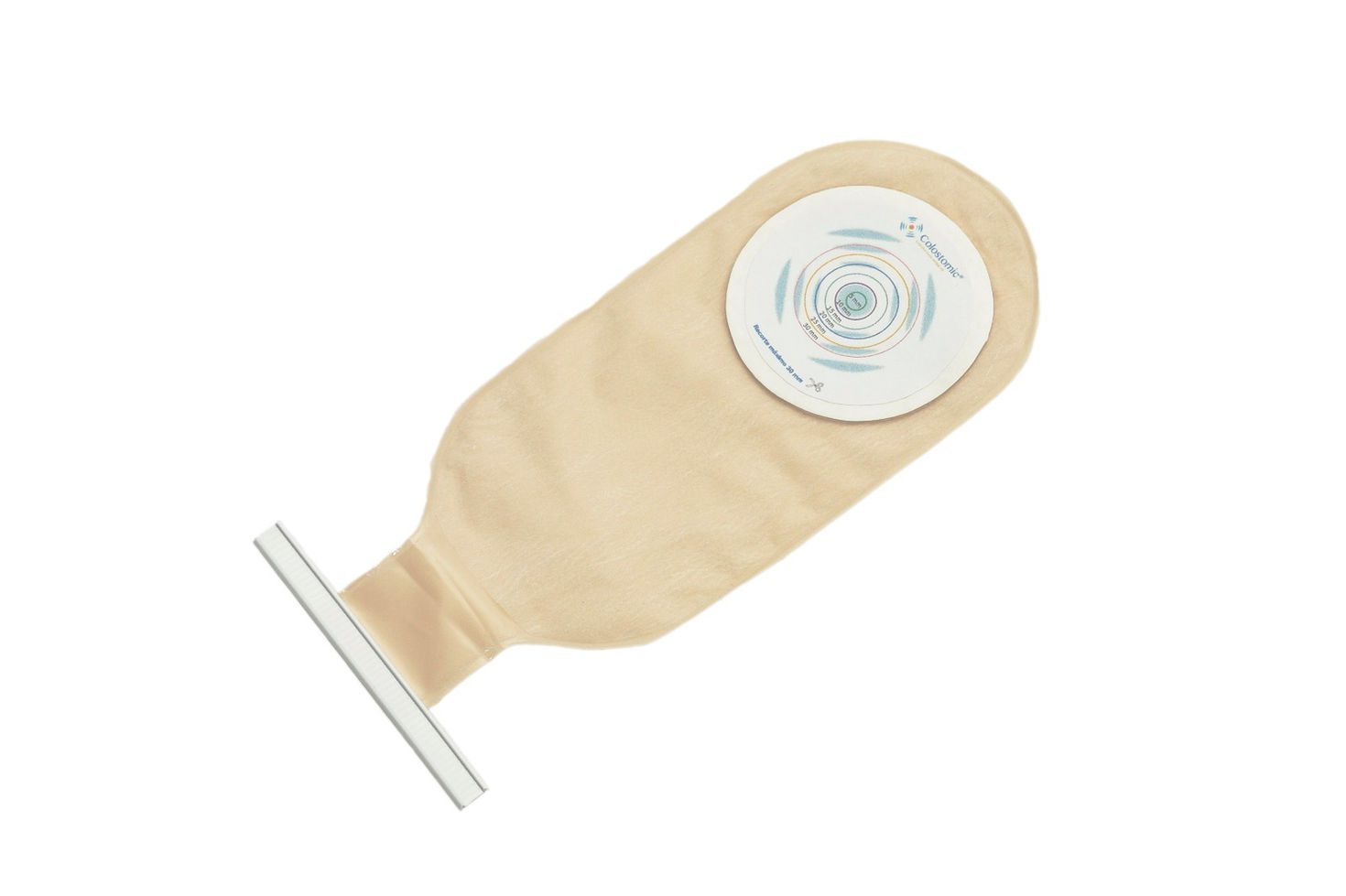 Bolsa para ileostomía o colostomía, tamaño neonatal, autoadherible, de plástico grado médico, suave transparente, a prueba de olor, drenable, en forma de botella de 21.5 x 8.6 cm abierta en su parte más angosta, con cuello de 5 a 6 cm de ancho y 3 a 5 cm de largo, con pinza de seguridad o mecanismo de cierre, con protector de piel integrado a base de carboximetilcelulosa sódica. Con adhesivo, con guía recortable que permita abrir orificio para el estoma a diferentes medidas que van de 6 a 40 mm, la cara interna deberá tener un protector que evite la irritación de la piel.